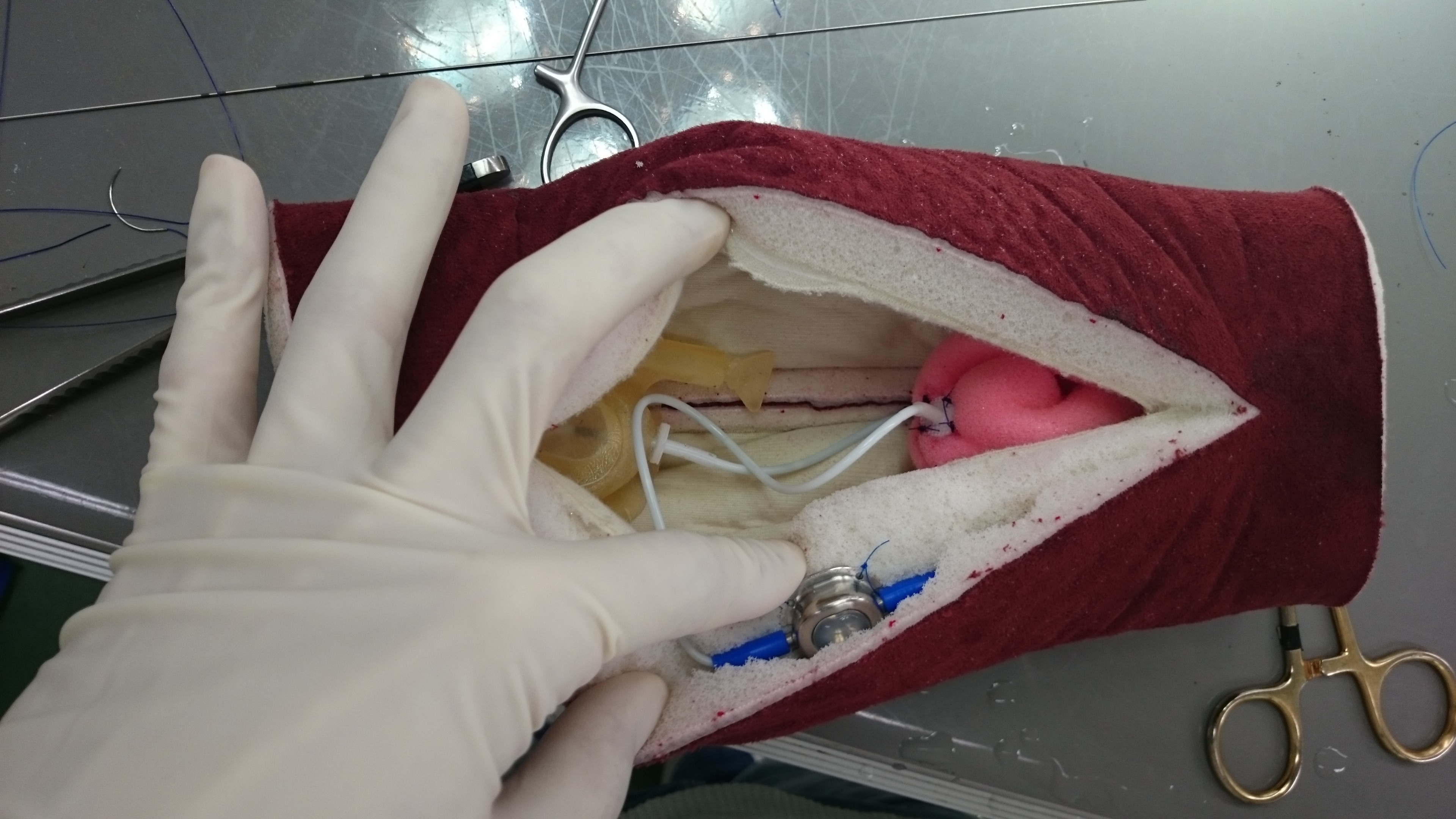 写真は、実習で使用した模型です。左の黄色いのが腎臓の模型で、右のピンク色のスポンジが膀胱に見立てたものです。それぞれ白いチューブで皮下のポートに繋がっています。このポートから、石灰化を防止する液体を定期的に通して、チューブが詰まらないように維持します。