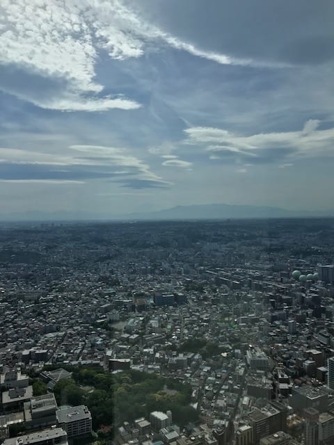 写真の中央にうっすら影が見えるのが富士山です。